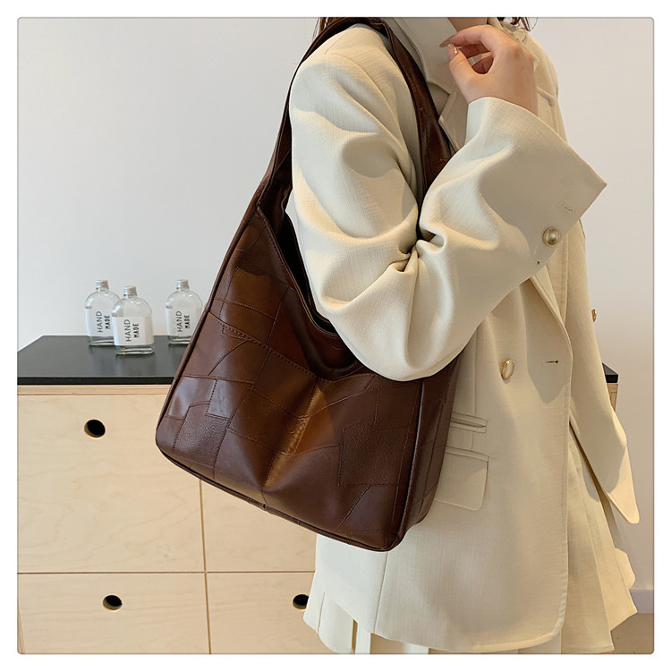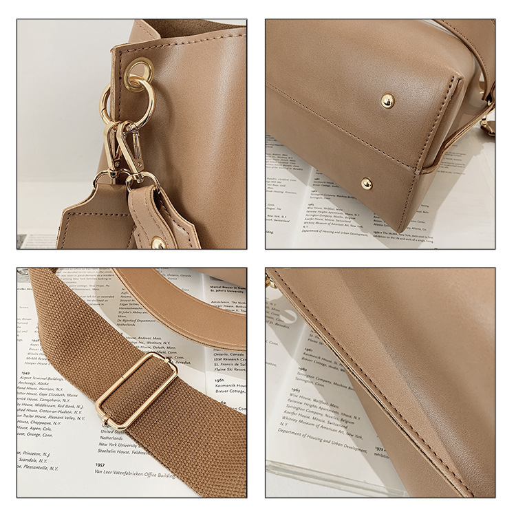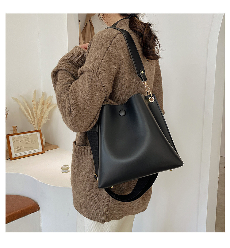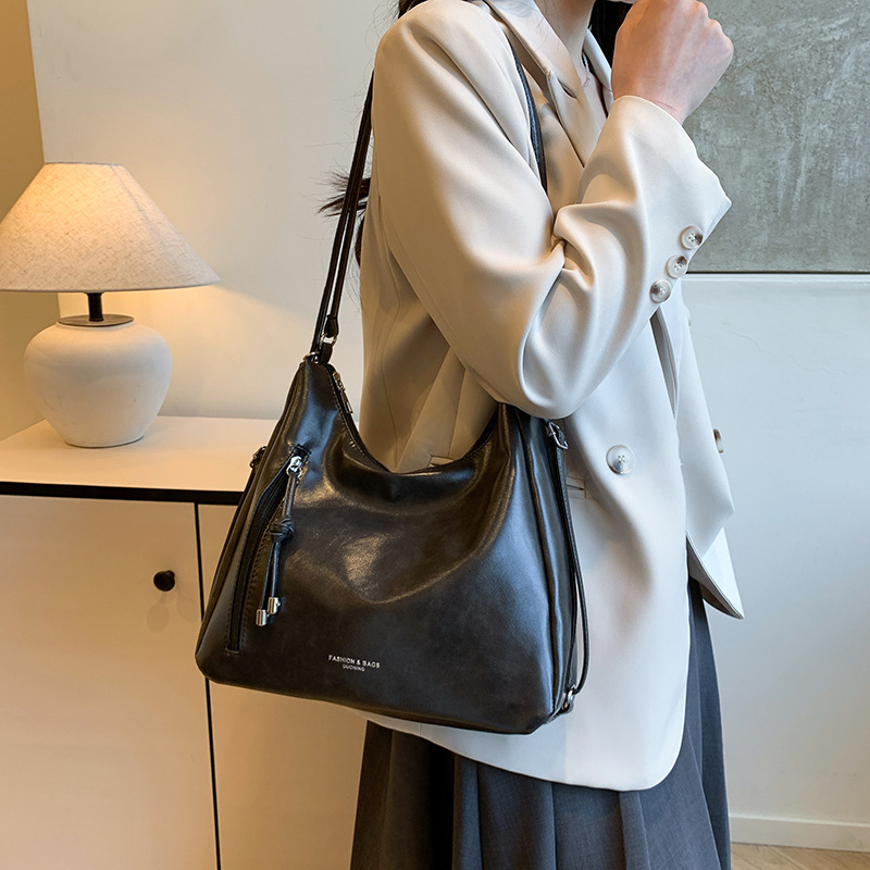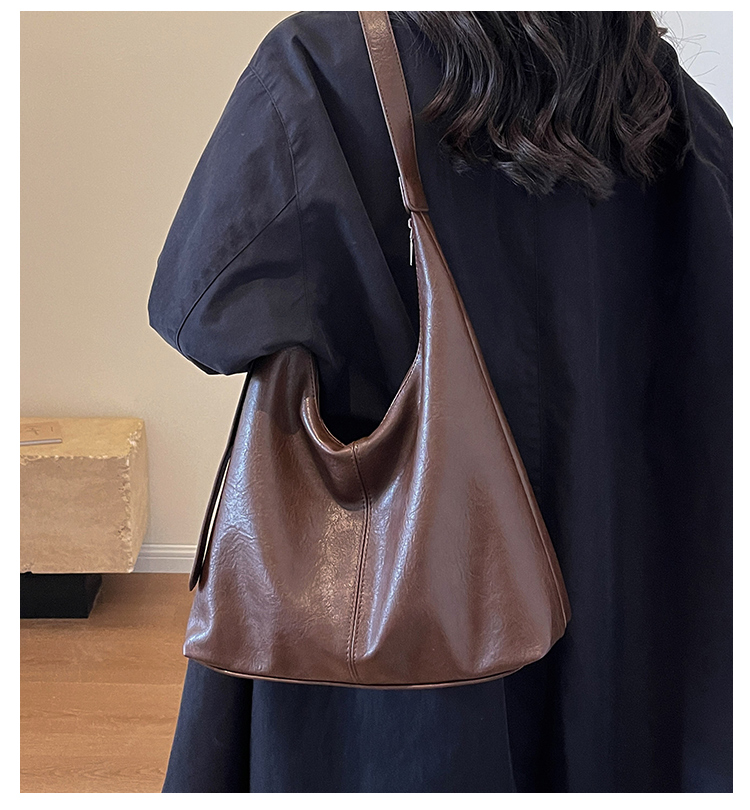 上品な光沢感が魅力の巾着型ショルダーバッグ。スマートでありながら収納力抜群で、書類やタブレットもすっきり収まります。