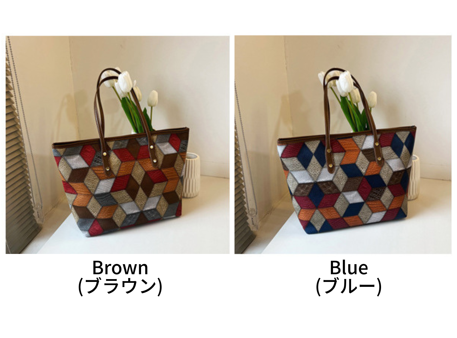 幾何学的な立体キューブ柄を組み合わせた、存在感抜群のトートバッグ